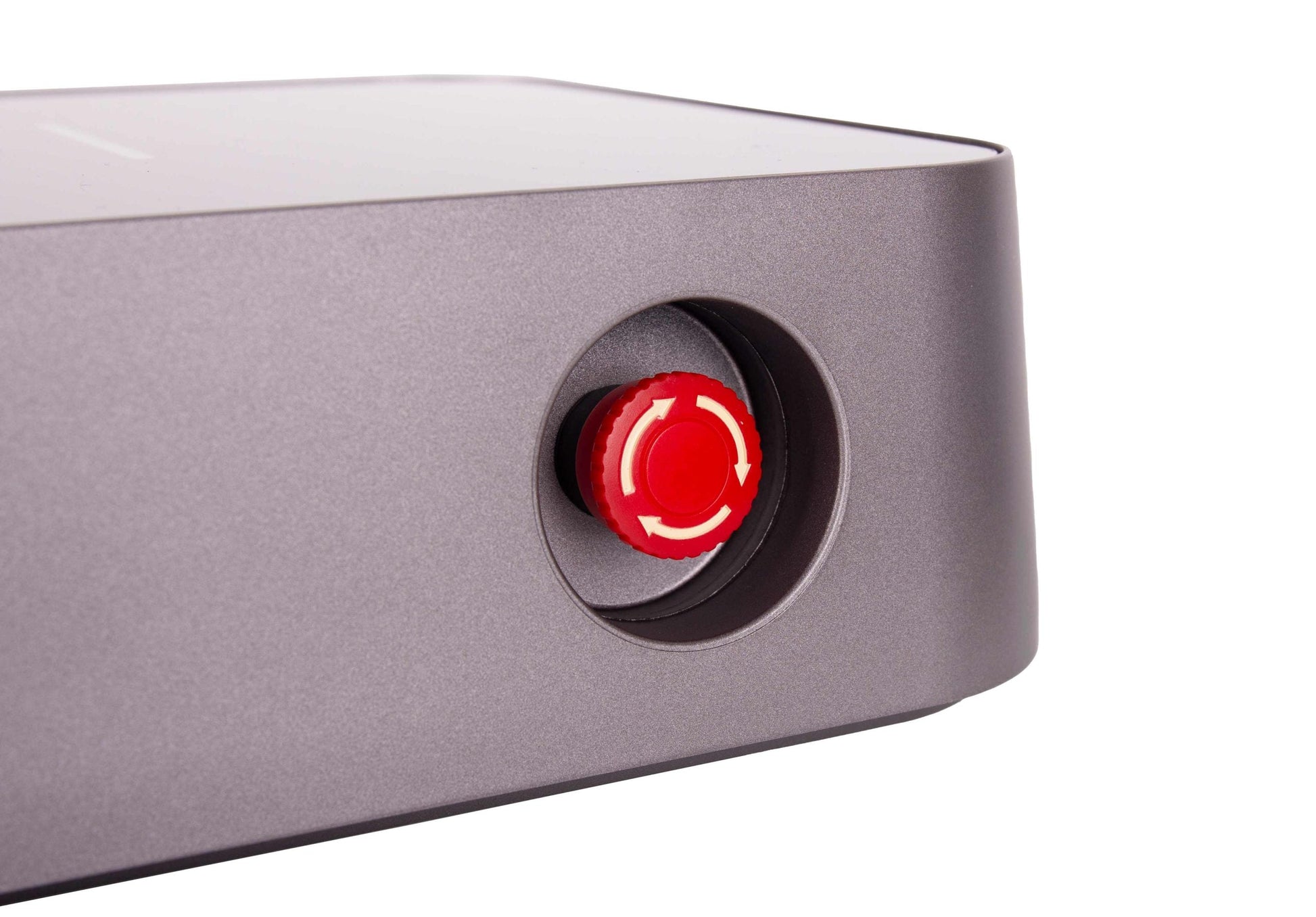 Interface intuitivo: Mostrador indicativo de estado com LEDs vermelho, verde e amarelo oferece informação do estado de carga em tempo real. Possui botão de emergência para interromper abastecimento.