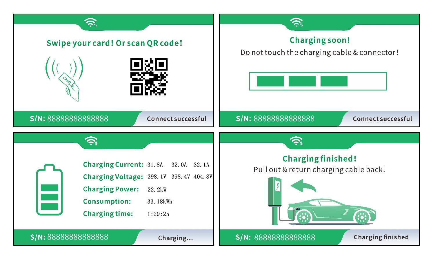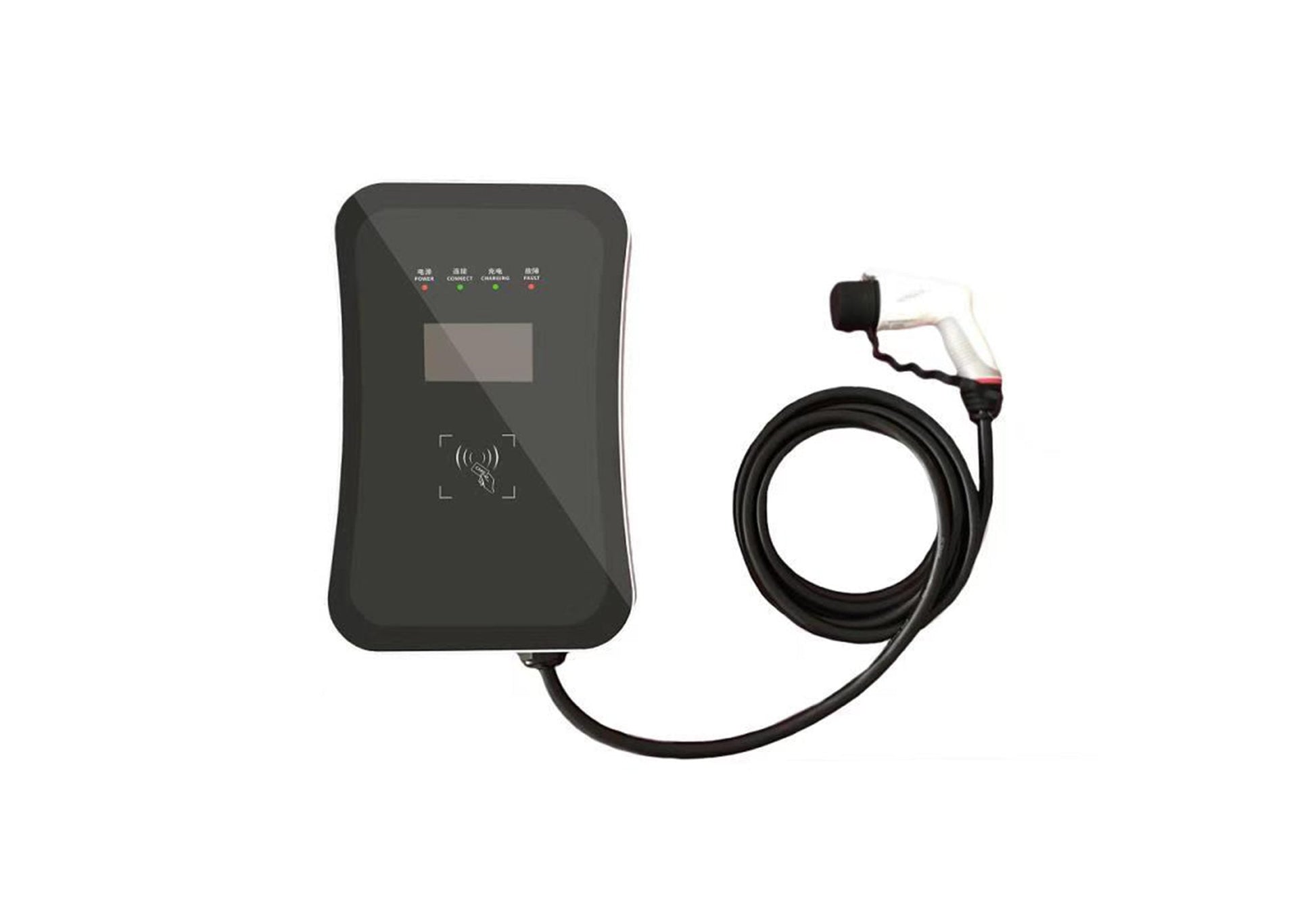 Display intuitivo: O ecrã LCD oferece informação de estado de carga em tempo real. Controlo de carregamento por RFID. Possui botão de emergência para interromper abastecimento.