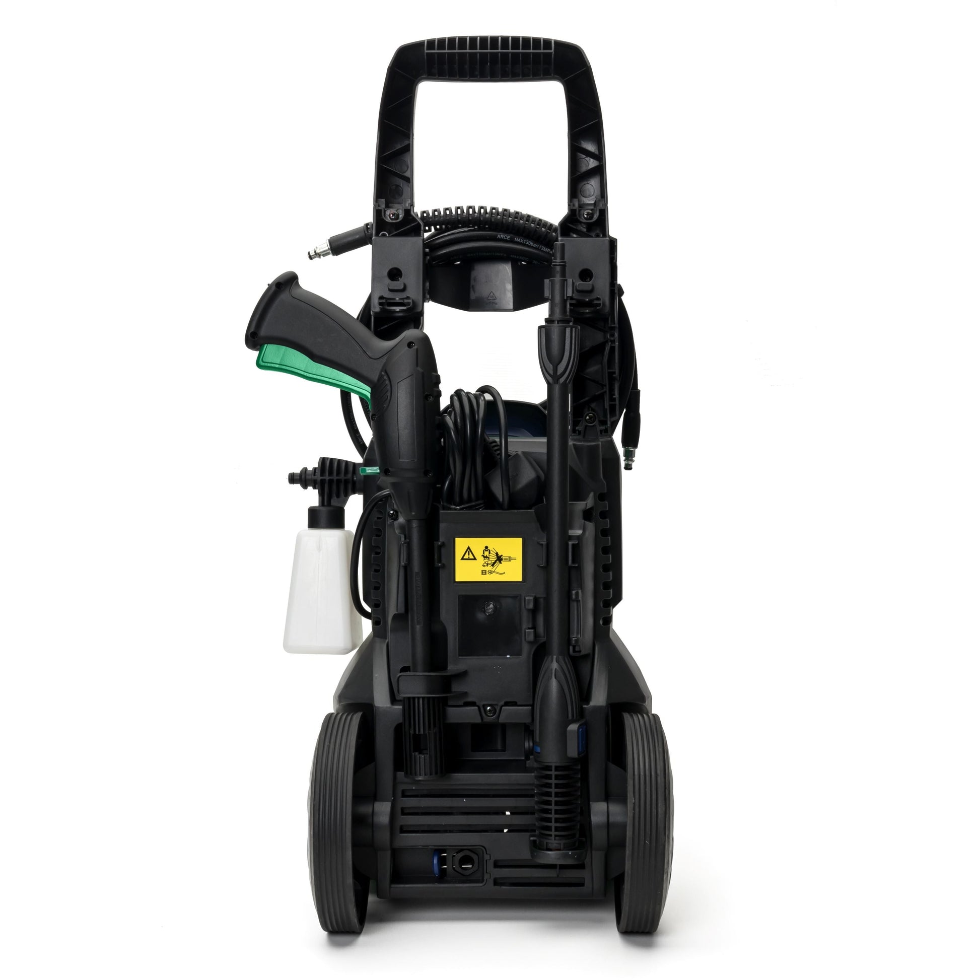 Lavadora com rodas e pega extensível para fácil manuseamento, mangueira com 5 metros de comprimento e filtro de água para proteger o motor da sujidade.