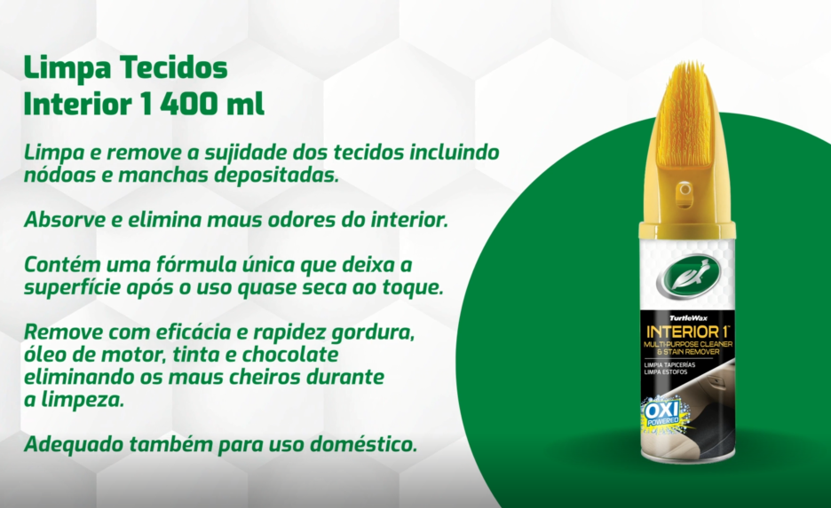 O limpa tecidos "Interior 1" da Turtle Wax limpa e remove a sujidade dos tecidos incluindo nódoas e manchas depositadas.