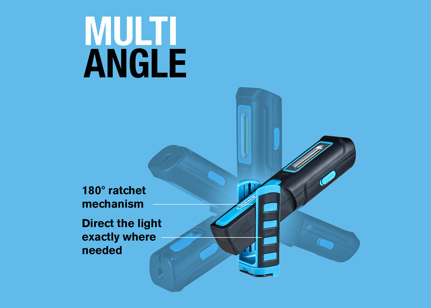 - Íman na parte de trás e na base da luz led, bem como um gancho giratório para trabalhar com as mãos livres
