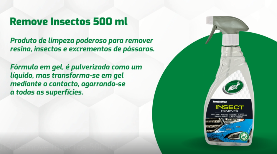 O Remove Insectos da Turtle Wax possui poderosos detergentes que dissolvem manchas exteriores problemáticas comuns, tais como, o alcatrão, a resina e os insectos.