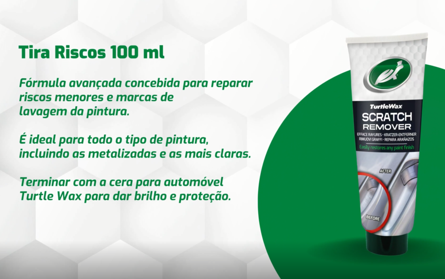 Restaura facilmente qualquer acabamento de pintura. para arranhões profundos e marcas de gravilha usar uma tinta de retoque (de acordo com as instruções do fabricante) e aplicar o produto Tira Riscos para uniformizar o acabamento. Terminar com a cera para automóvel Turtle Wax para dar brilho e proteção.